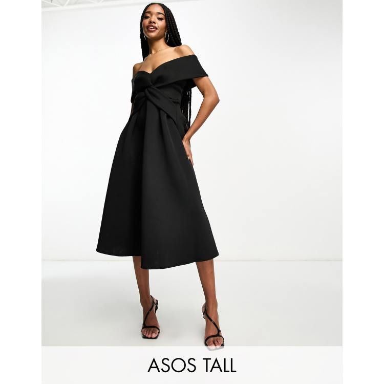 ASOS DESIGN Tall twist off the shoulder prom skater midi dress in black
