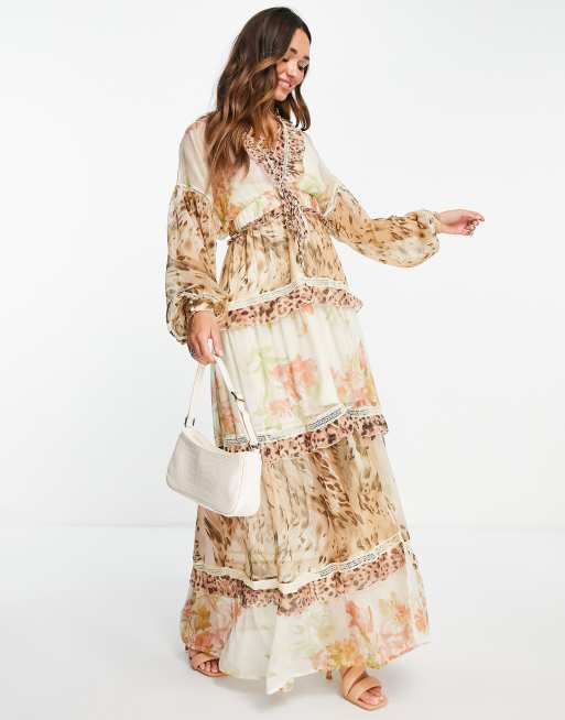ASOS DESIGN printed tiered textured maxi dress with ruffle detail and lace trim