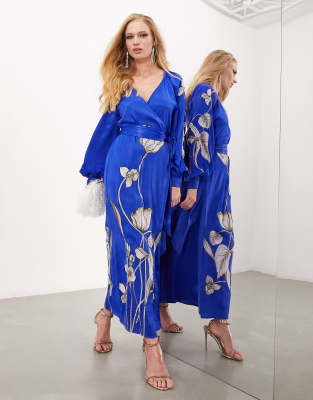 ASOS EDITION satin wrap midi dress with trailing tulip embroidery in