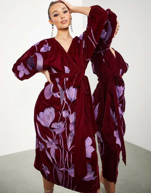 ASOS EDITION midi wrap dress in velvet with floral embroidery in oxblood