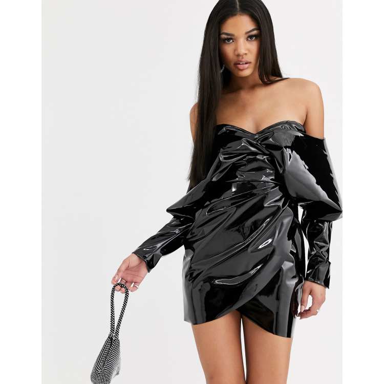 ASOS DESIGN off shoulder long sleeve vinyl wrap mini dress