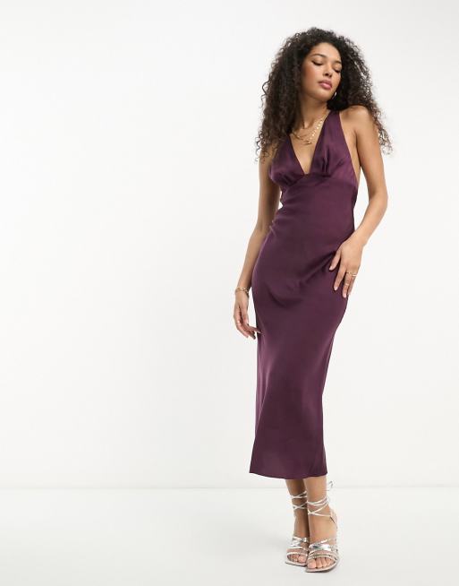 ASOS DESIGN satin bias cut plunge racer back midi dress in wine