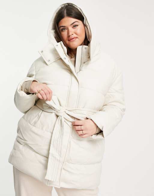 ASOS DESIGN Curve leather look belted puffer jacket in cream