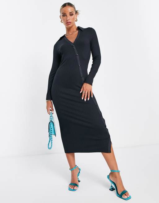 French Connection asymmetric button front midi jersey dress in black