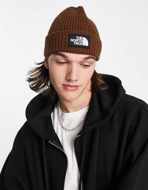 The North Face Beanie met TNF logo in kader en omslag in bruin