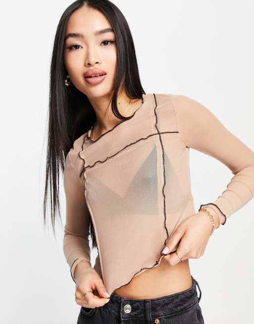 Beige Mesh Long Sleeve Crop Top Aaima Rebellious Fashion