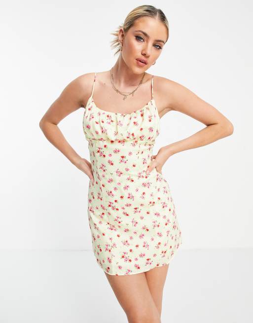 Bershka satin floral printed dress in lemon print with lace up back