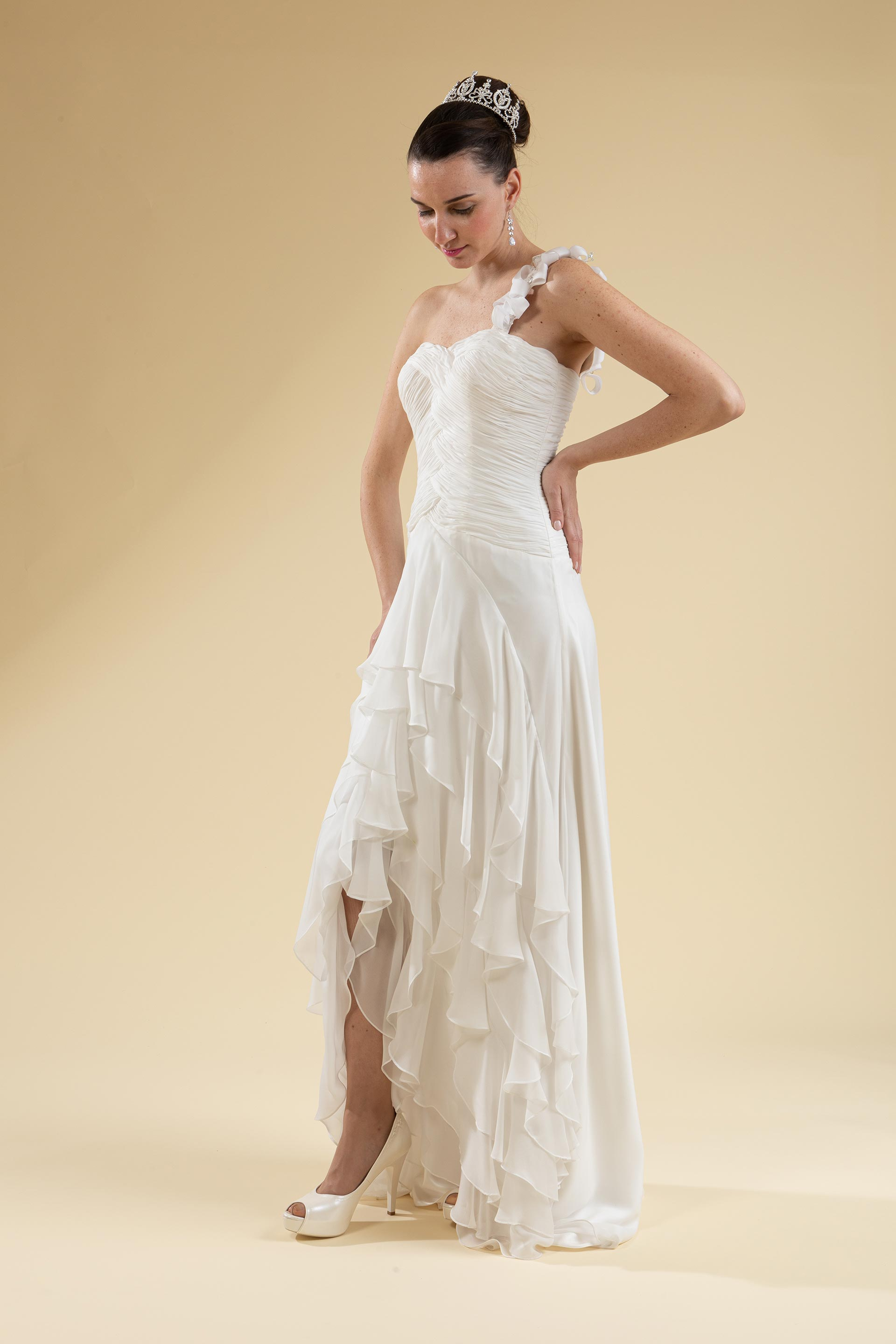 Abito da cerimonia e sposa corto davanti lungo dietro Mod. Alma LeMieNozze SHOP