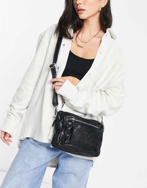 ASOS DESIGN leather cross body bag with zip pocket in black