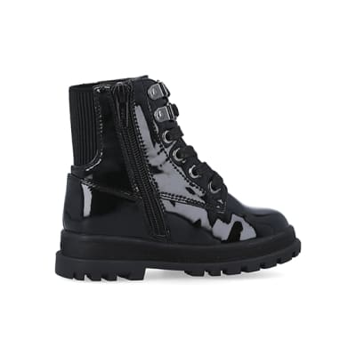Black patent sales hiker boots, Mini girls black patent hiker boots River Island sales